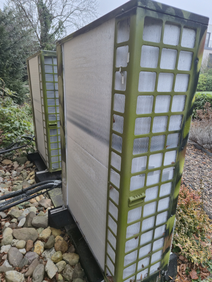 hier bespielhaft eine Kaskaden-Wärmepumpe, bei der beide Geräte gleichzeitig fast komplett eingefroren sind.