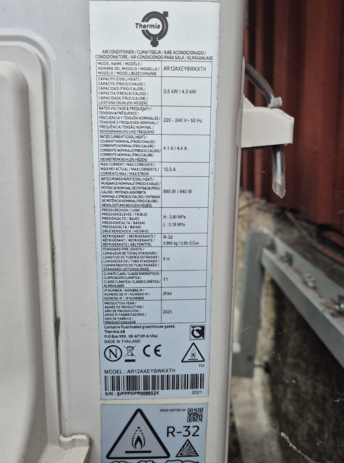 Dieses Klimagerät kommt aus Thailand, leistet bei einer Stromaufnahme von max. 940 Watt immerhin max. 4,0 kw Heizleistung. Der E-Stab hat 6,0 kw Heizleistung.