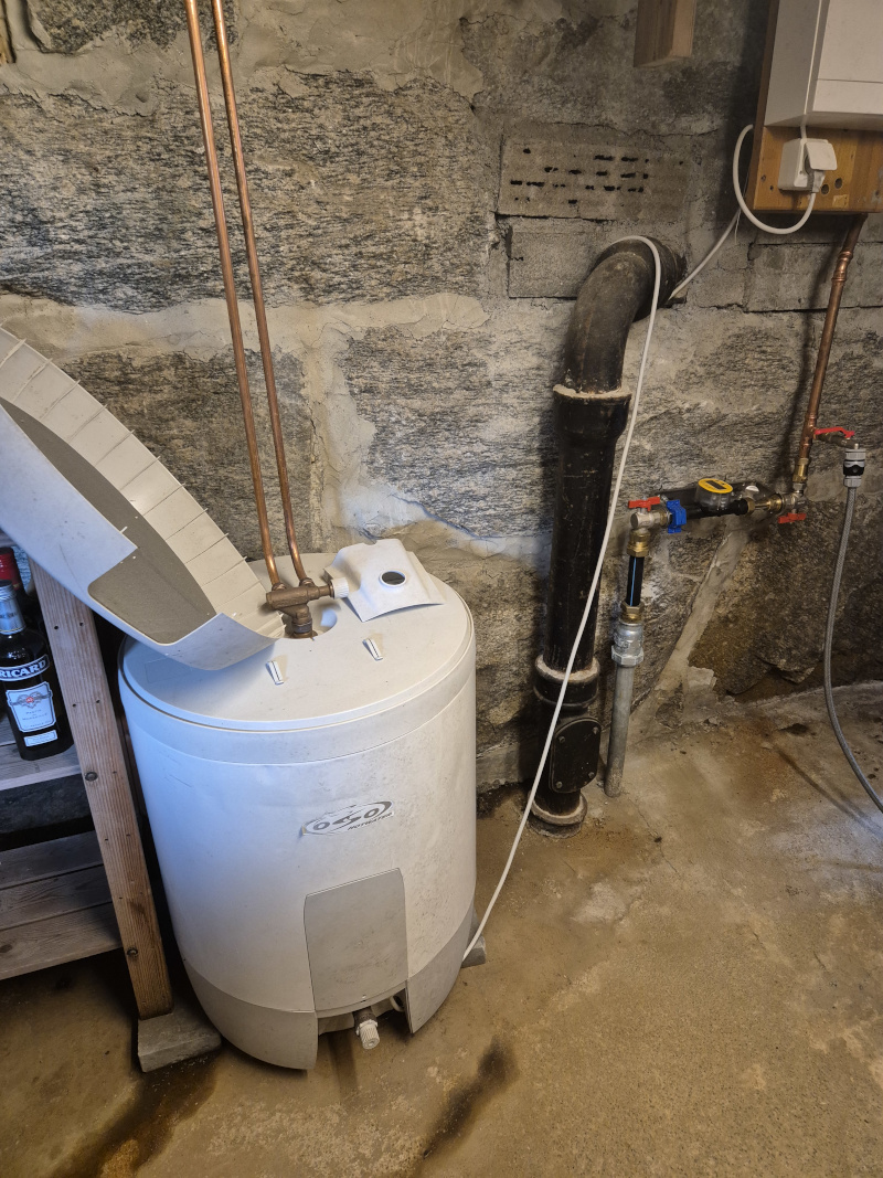 Das Innengerät ist bei diesem Wohnhaus im kleinen Keller aufgehängt, aber ohne Puffer o.ä. . Die Energie geht direkt vom Innengerät in die Heizkörper, was zu einem erhöhten Verschleiß führt.