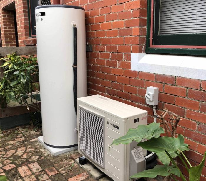Sie steht samt strombetriebenem Warmwasserspeicher vor dem Haus.