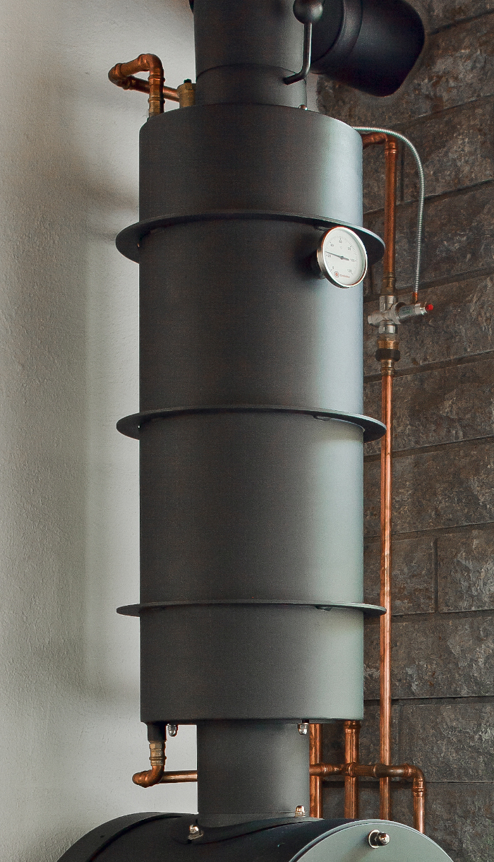 Die Rohranschlüssen können in Kupfer gepresst (wie auf dem Foto unten), stilecht in Kupfer hartgelötet oder extrem stilecht in schwarzem Stahlrohr ausgeführt werden.