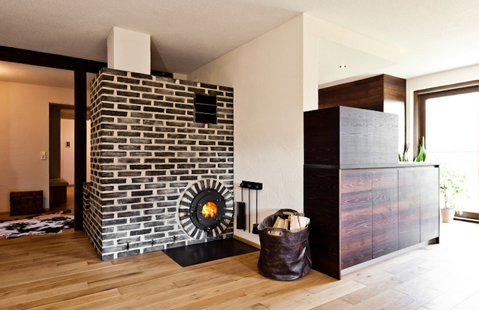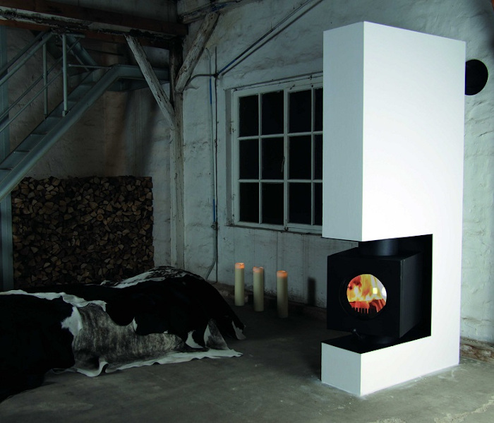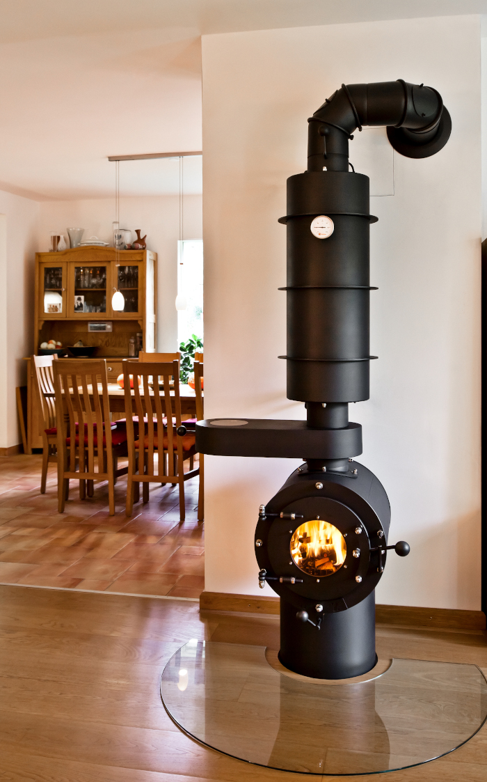 unten: drehbarer Grundofen, Wassertasche in Skulptur-Element integriert